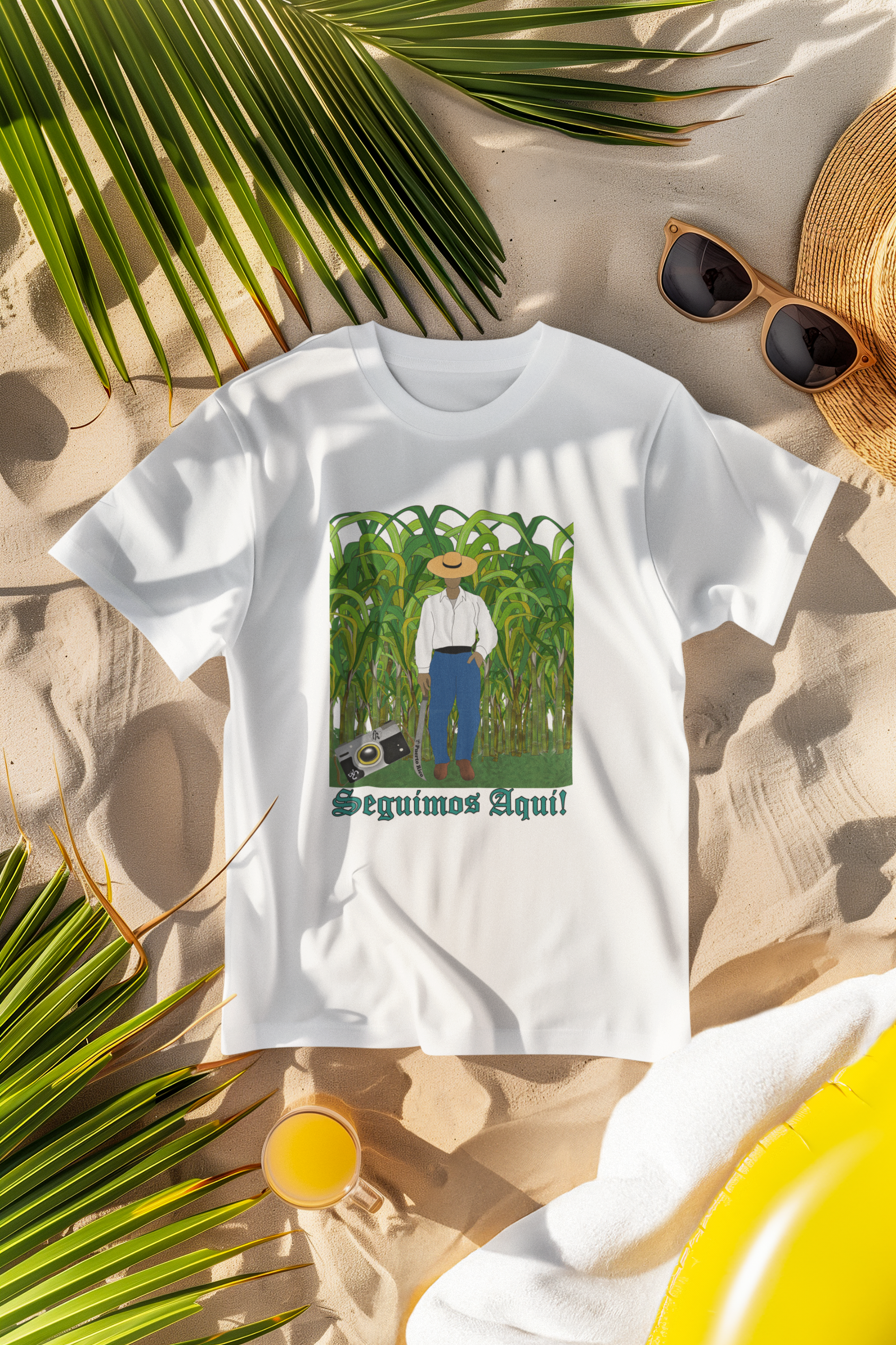 Celebra nuestro orgullo boricua con este diseño inspirado en uno de los cultivos más importantes de la isla desde 1898 hasta la primavera del 2000, La Caña de azúcar. Este diseño, hecho con colores vibrantes, transmite un mensaje de esperanza, amor y determinación: “Seguimos Aquí”, Aunque la isla ha experimentado cambios que han llevado a muchos de nuestros habitantes locales a mudarse fuera de la isla, que es parte de su identidad y esencia, queríamos crear un elemento de esperanza y determinación para no perder una de las cosas que nos hace completos, nuestra cultura.